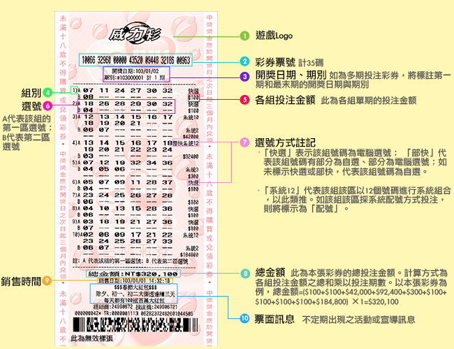 注意事項:彩券銷售後如遇有加開期數之情況,預購及多期投注之期數將順延。若彩券上的資料和電腦紀錄的資料不同,以電腦紀錄資料為準。